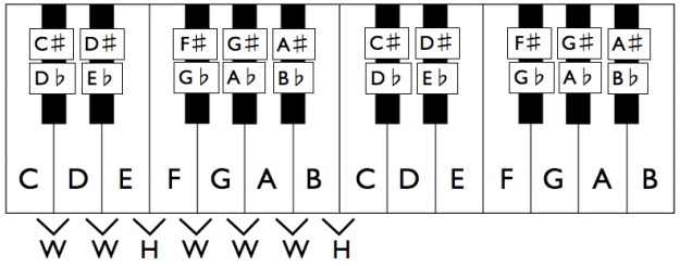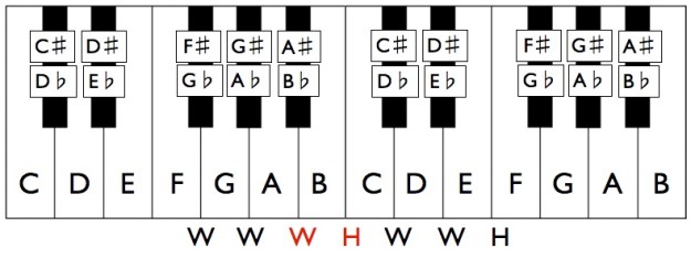 • We mentioned the “half step” (H) previously which is the distance between two consecutive notes. There is also the “whole step” (W) which is equivalent to two half steps